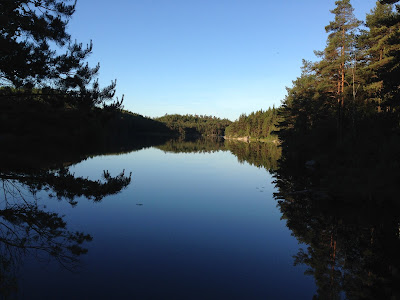 Det hade svalnat något, men var fortfarande varmt. Jag la mig ovanpå sovsäcken fullt påklädd men tog snart av mig det ena efter det andra. Svetten dröp och att krypa in i säcken var inte att tänka på. Fåglarna tjattrade, asplöven rasslade, änderna flaxade. Jag började väl tänka att jag nog inte kommer att somna strax innan jag gjorde det. Ljuset dröjde sig kvar till cirka 23, djurlivet tystnade och rätt som det var insåg jag att det var lite svalt och jag kröp ner i säcken. Ingen ska påstå att jag hade en ostörd sömn den natten men när det som störde mest var storlommen som tjöt över sjön eller nattskärran som knarrande ekade i natten kan jag inte klaga. Inte heller det tassande och nosande djur under småtimmarna (räv?) som passerade utanför tältduken hamnar på minussidan måste jag säga, även om jag erkänner att jag började fundera på om jag verkligen packat ner maten ordentligt...